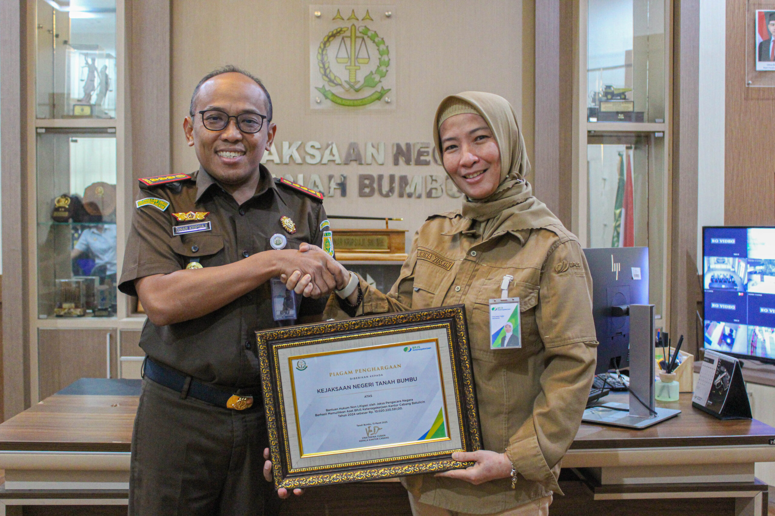 Pemberian piagam penghargaan tersebut dilakukan langsung oleh Kepala Kejaksaan Negeri Tanah Bumbu, Dinar Kripsiaji dan Kepala Kantor BPJS Ketenagakerjaan Cabang Batulicin, Vina Dwina Yuskin.