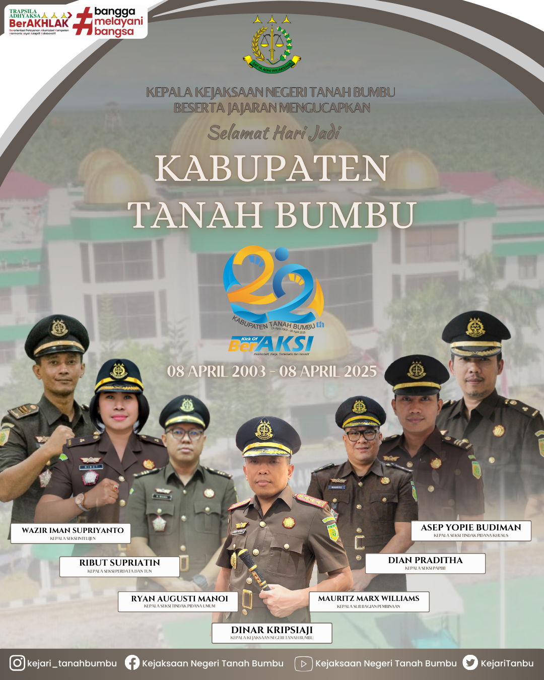 Kepala Kejaksaan Negeri Tanah Bumbu, Dinar Kripsiaji beserta jajaran mengucapkan Selamat Hari Jadi Kabupaten Tanah Bumbu ke-22 Tahun 2025.