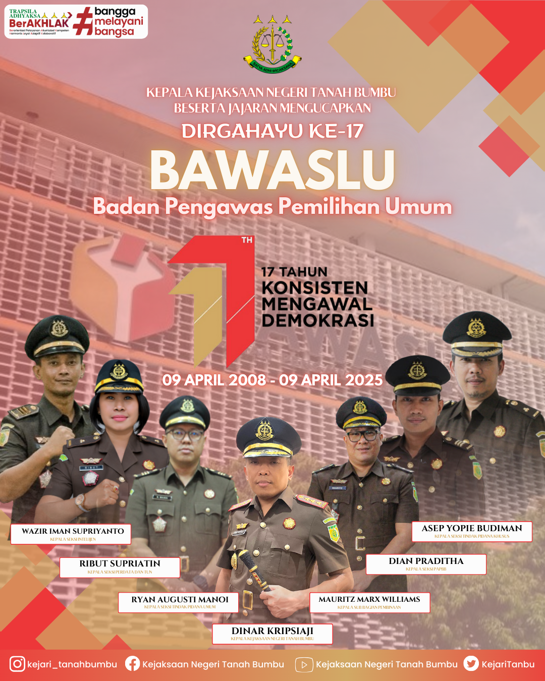 Kepala Kejaksaan Negeri Tanah Bumbu, Dinar Kripsiaji beserta jajaran mengucapkan Dirgahayu ke-17 Badan Pengawas Pemilihan Umum Republik Indonesia 09 April 2008 – 09 April 2025.
