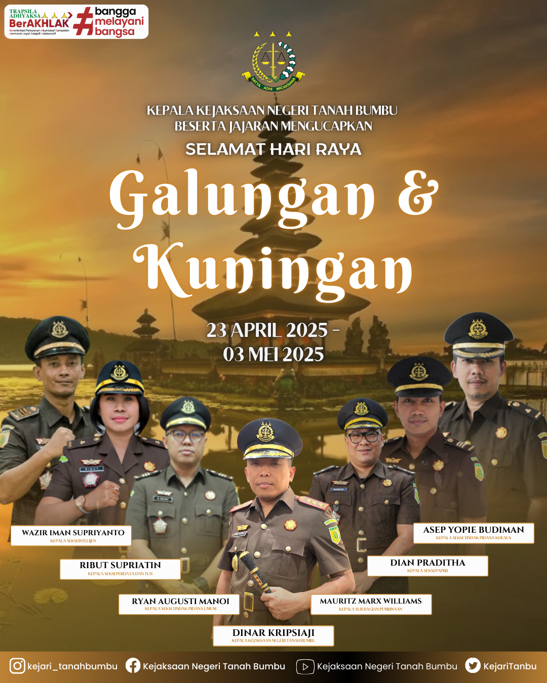 Kepala Kejaksaan Negeri Tanah Bumbu, Dinar Kripsiaji beserta jajaran mengucapkan selamat Hari Raya Galungan & Kuningan, 23 April 2025 – 03 Mei 2025.