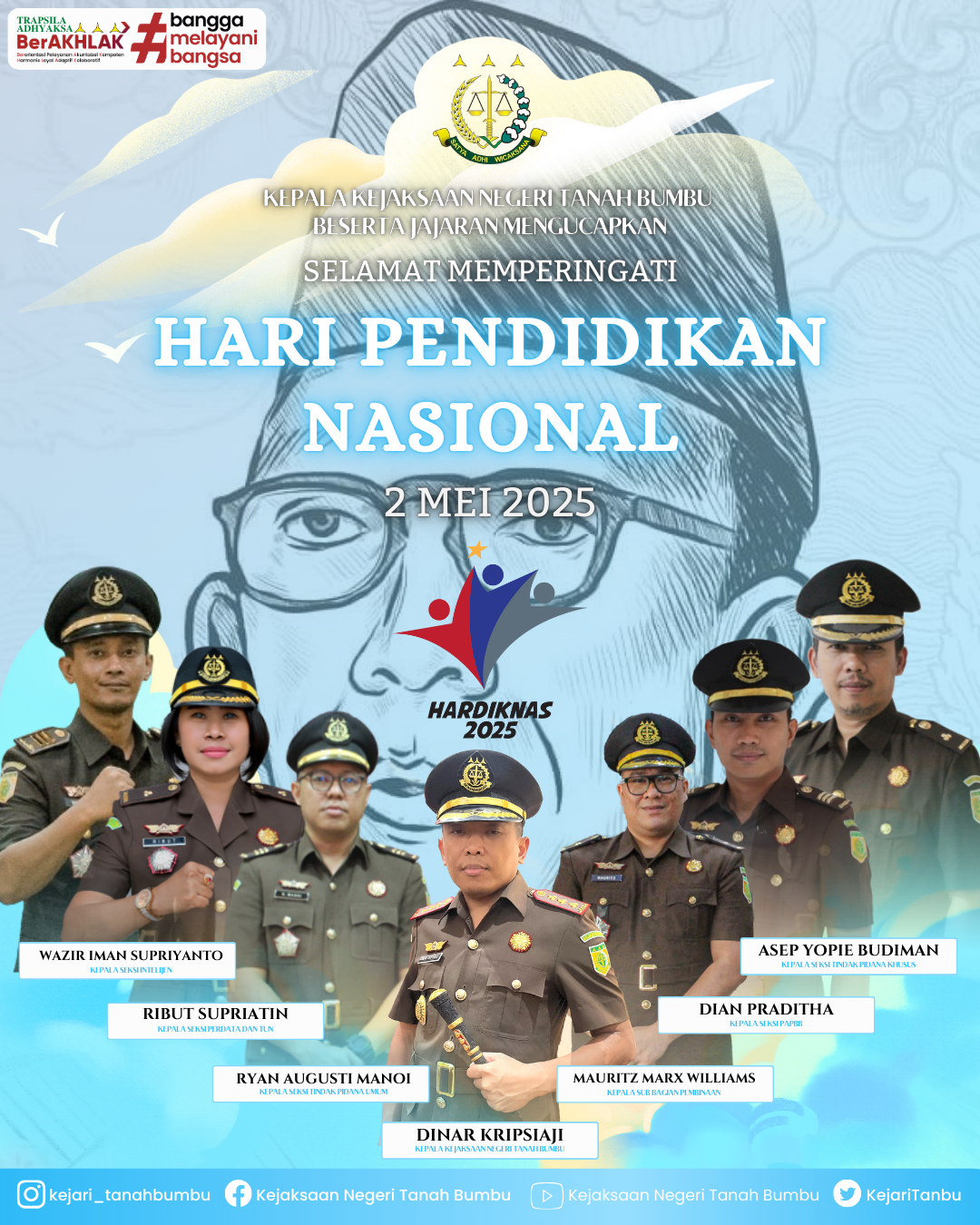 Kepala Kejaksaan Negeri Tanah Bumbu, Dinar Kripsiaji beserta seluruh jajaran mengucapkan Selamat Memperingati Hari Pendidikan Nasional, 2 Mei 2025.