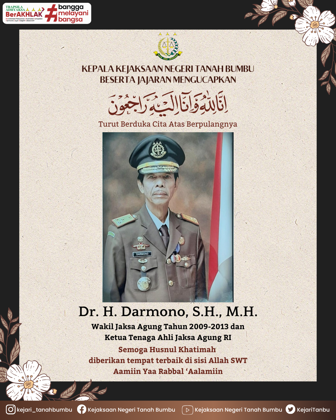 Kepala Kejaksaan Negeri Tanah Bumbu, Dinar Kripsiaji beserta seluruh jajaran mengucapkan turut berduka cita atas berpulangnya Dr. H. Darmono, S.H., M.H., Wakil Jaksa Agung Tahun 2009-2013 dan Ketua Tenaga Ahli Jaksa Agung Republik Indonesia.