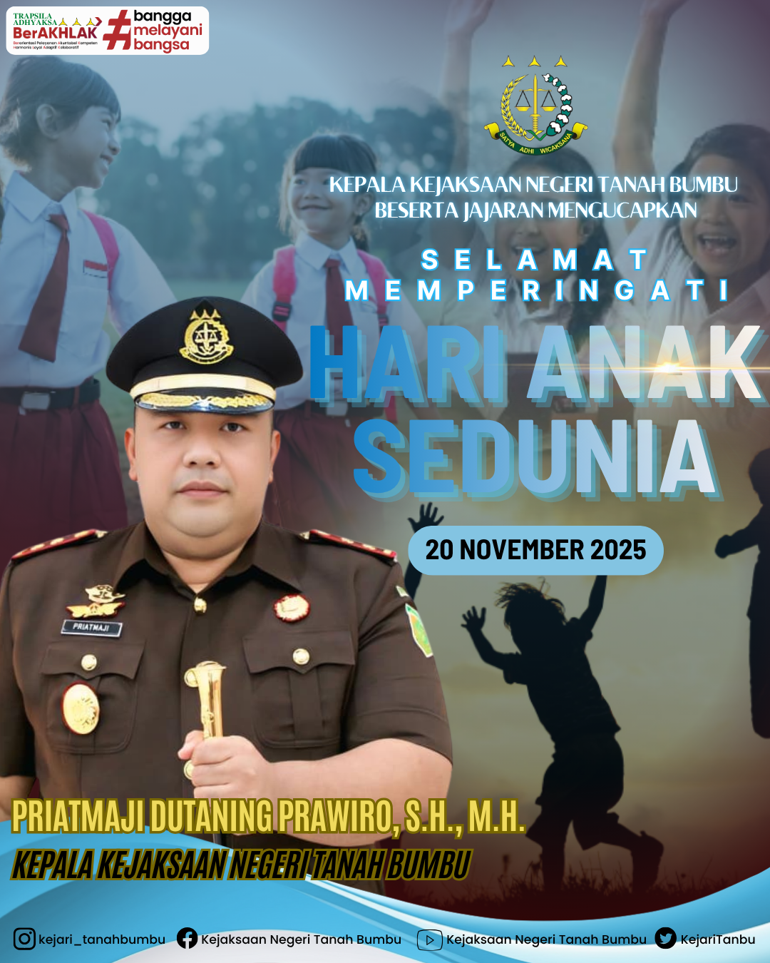 Kepala Kejaksaan Negeri Tanah Bumbu, Priatmaji Dutaning Prawiro, S.H., M.H. beserta jajaran mengucapkan Selamat Memperingati Hari Anak Sedunia, 20 November 2025.