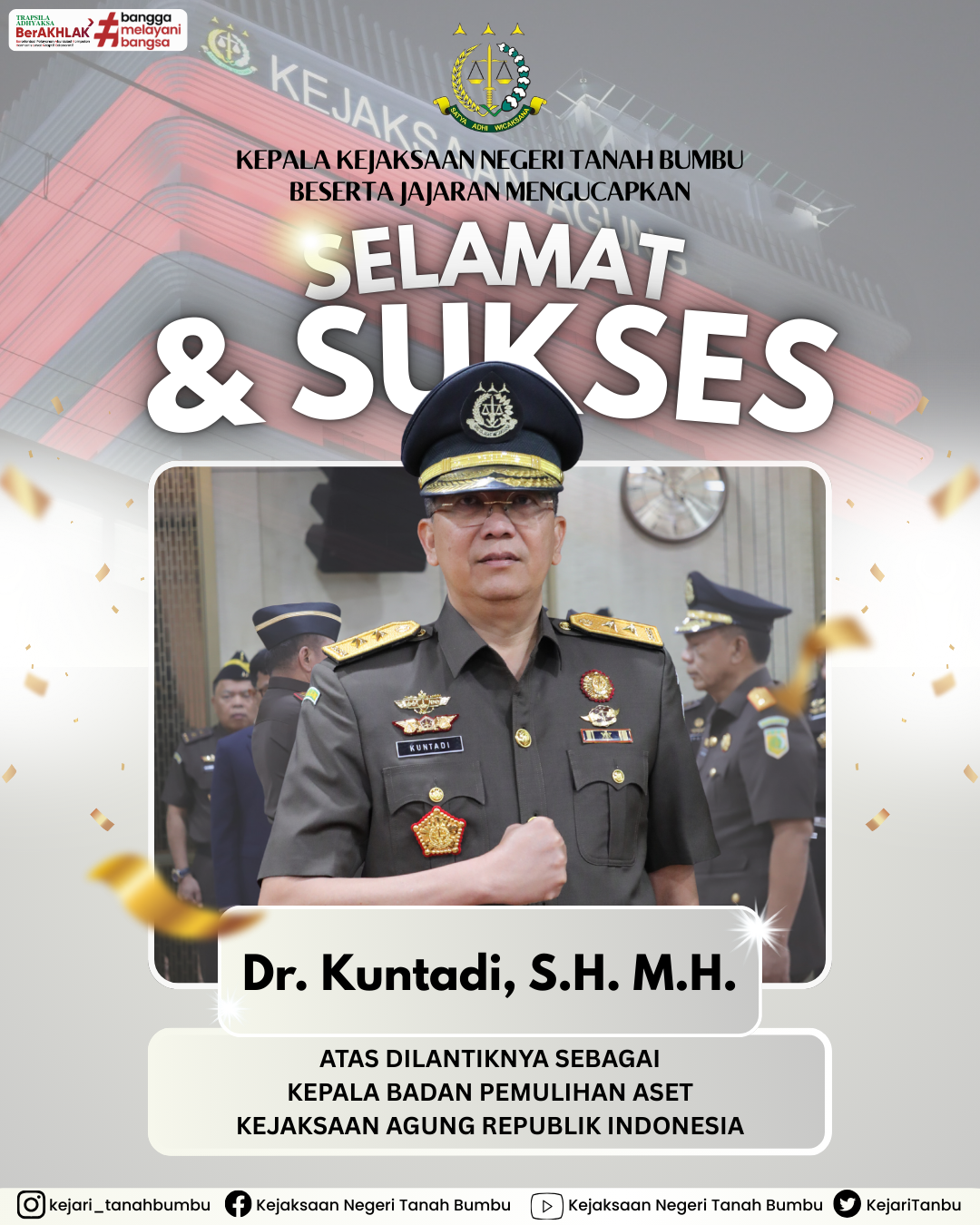 Kepala Kejaksaan Negeri Tanah Bumbu, Priatmaji Dutaning Prawiro, S.H., M.H. beserta jajaran mengucapkan selamat dan sukses atas dilantiknya Dr. Kuntadi, S.H., M.H. sebagai Kepala Badan Pemulihan Aset Kejaksaan Agung Republik Indonesia.