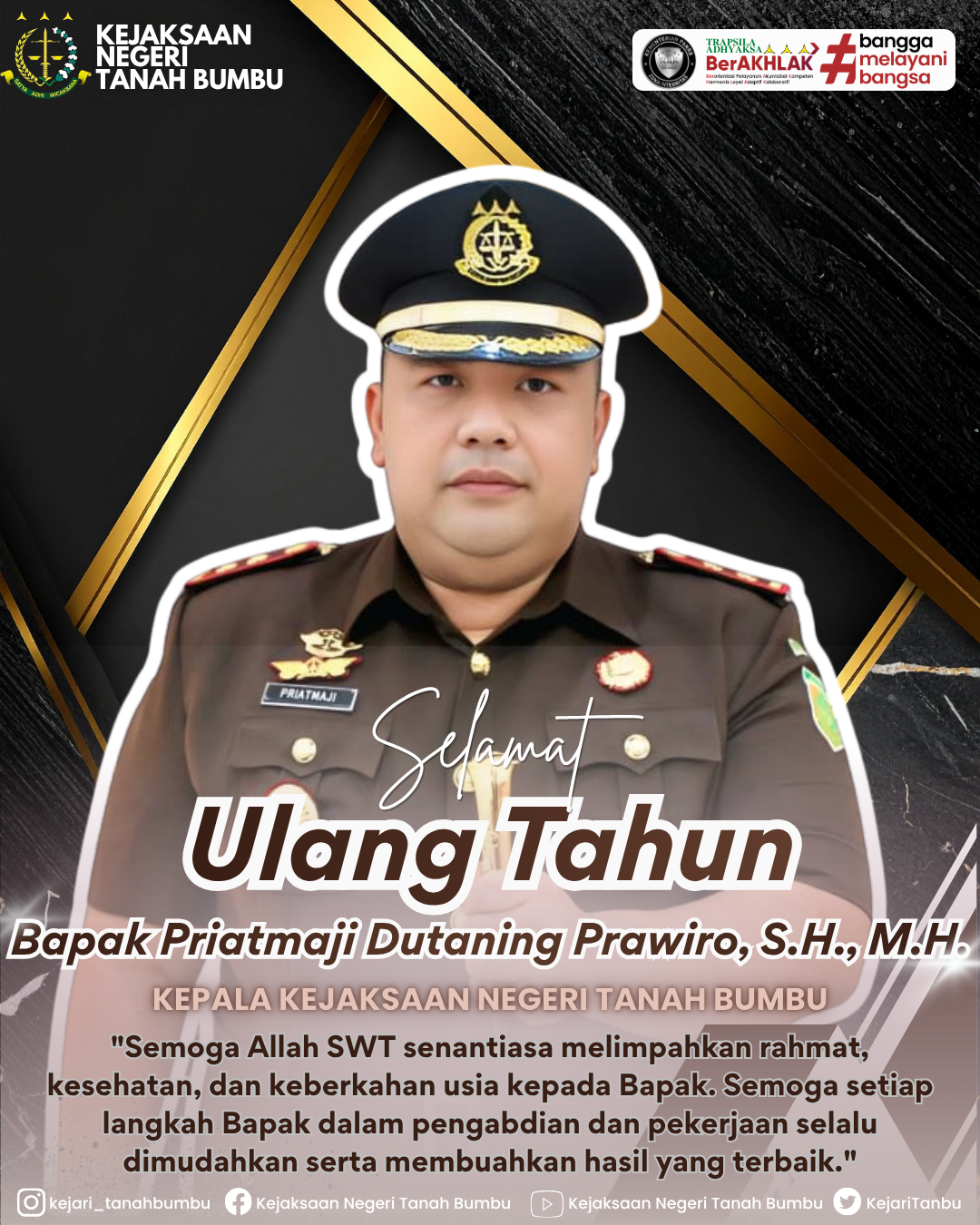 Seluruh keluarga besar Kejaksaan Negeri Tanah Bumbu mengucapkan selamat ulang tahun Kepala Kejaksaan Negeri Tanah Bumbu, Bapak Priatmaji Dutaning Prawiro, S.H., M.H.