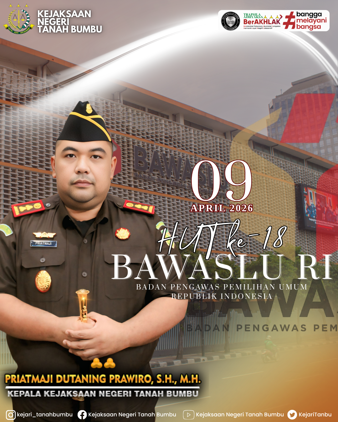Kepala Kejaksaan Negeri Tanah Bumbu, Priatmaji Dutaning Prawiro, S.H., M.H. beserta seluruh jajaran mengucapkan selamat memperingati HUT Badan Pengawas Pemilihan Umum Republik Indonesia ke-18 Tahun 2026.